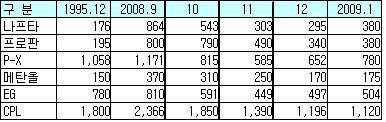 표, 그래프: | 석유화학제품 수입가격 변화(2009.1) | <화학저널 2009/2/16> |