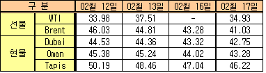 2월17일 WTI 2.58달러 폭락해 34.93달러 … Brentㆍ두바이유도 약세 국제유가는 2월17일 글로벌 경기침체 심화 및 장기화 전망에 따라 석유 수요의 감소가 지속될 것으로 전망되면서 하락했다.한국석유공사에 따르면, 뉴욕상업거래소(NYMEX)의 WTI(서부텍사스 경질유) 선물유가는 2.58달러 폭락해 34.93달러를 형성했으며, Brent 선물유가도 41.03달러로 1.53달러 하락했다. 두바이(Dubai)유 현물유가는 전일대비 배럴당 0.57달러 내린 42.75달러에 거래를 마감했다.