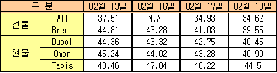2월18일 2.30달러 폭락 40.45달러 … WTIㆍBrent유도 약세 국제유가는 2월18일 국제유가는 경기침체 심화 및 미국의 원유 재고 증가 전망으로 하락했다.한국석유공사에 따르면, 뉴욕상업거래소(NYMEX)의 WTI(서부텍사스 경질유) 선물유가는 배럴당 0.31달러 하락해 34.62달러를 형성했으며, Brent 선물유가도 39.55달러로 1.48달러 하락했다. 두바이(Dubai)유 현물유가는 글로벌 경기침체 심화 및 장기화 전망에 따라 2.30달러 폭락한 40.45달러에 거래를 마감했다.