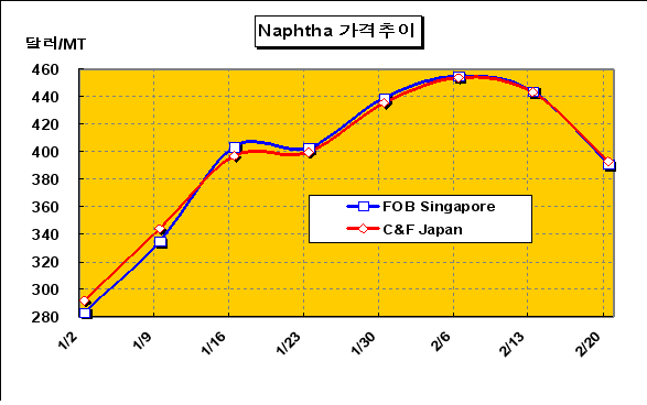 C&F Japan 389-396달러로 50달러 급락 … 차익실현 매물 봇물 나프타 가격은 2월 셋째 주에 C&F Japan 톤당 393달러로 50달러 급락했다.아시아 나프타(Naphtha) 가격은 일본의 구매 수요 증가에도 불구하고 국제유가 하락의 영향으로 5주 만에 400달러가 붕괴됐다. 일본의 스팀 크래커들이 회기연도 종료를 앞두고 재고를 감축하기 위해 장기간에 걸쳐 가동률을 감축하면서 재고가 바닥을 드러내자 4월 상반기 인도물량 구매에 나섰다. 그러나 국제유가가 미국의 증시 하락, 경제침체 심화에 따른 석유 수요 감소에 대한 우려의 목소리가 높아지면서 국제유가가 38달러로 하락하자 일부 유통기업들이 차익을 노리고 매물을 대량 판매했기 때문이다. Reliance는 3월26-29일 인도물량 8만톤을 Cargill에게 판매한 것으로 파악되고 있다.