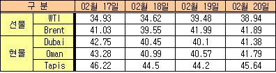 2월20일 1.28달러 올라 41.38달러 형성 … WTIㆍBrent유는 소폭 하락 2월20일 국제유가는 경기침체 심화에 따른 석유 수요 감소 우려가 지속되고 차익실현 매물이 출회되면서 하락했다.한국석유공사에 따르면, 뉴욕상업거래소(NYMEX)의 WTI(서부텍사스 경질유) 선물유가는 배럴당 38.94달러로 0.54달러 내렸으며, Brent 선물유가도 41.89달러로 0.35달러 하락했다. 두바이(Dubai)유 현물유가는 미국의 원유 재고 감소 소식이 뒤늦게 반영되면서 1.28달러 상승한 41.38달러에 거래를 마감했다.