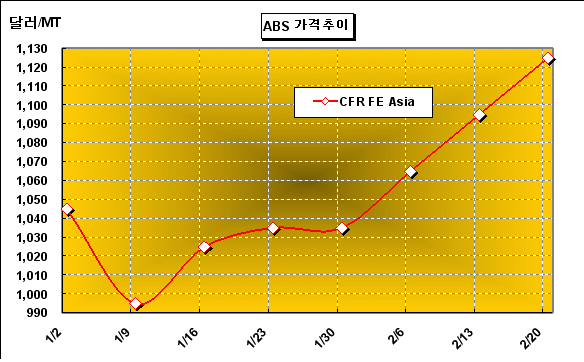 ABS 가격은 2월18일 CFR China 톤당 1120-1130달러, CFR SE Asia 톤당 1140-1150달러를 형성했다.