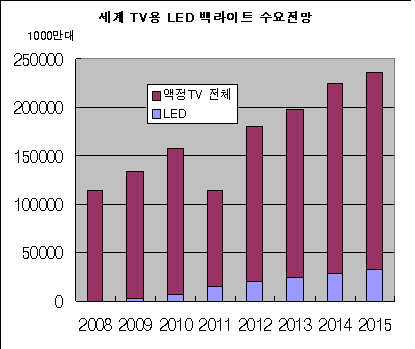 모바일 노트북용 LED는 Side View형이 주류였으나 Top View형은 내열 설계가 어려워 제조기업이 한정돼있으나 신규기업들은 Top View형 생산을 확대하고 있다. Top View형 노트북용 LED 백라이트의 가격은 Side View형의 절반 이하로 CCFL 백라이트와의 코스트 차이를 축소할 수 있다. 그러나 TV용 LED 백라이트는 여전히 CCFL과의 코스트 차이가 크기 때문에 2008년에도 LED 비중이 0.2%에 그쳤으며, 2012년에도 10%를 넘지 못할 것으로 예상된다. 40형의 LED 백라이트 코스트는 333달러로 CCFL과의 스프레드가 200달러 이상에 달한다. 앞으로 저코스트화, 발광효율 향상으로 탑재량이 줄어 2010년 4/4분기 시점에서는 203달러까지 낮아질 것으로 예상되지만 CCFL과 스프레드는 여전히 100달러 이상에 달할 전망이다. 한편, CCFL도 코스트 및 소비전력 감축이 진행됨에 따라 채용이 감소해 2010년에는 32형에서 평균 8개, 40형에서 12개까지 감소할 것으로 보인다. CCFL 메이커는 가스압을 감축하거나 관 둘레를 두껍게 함으로써 휘도를 향상시켜 채용증가를 노리고 있음에도 불구하고 2007년을 정점으로 수요가 감소하고 있어 2008년에는 4% 감소한 21억5200만개를 나타냈으며, 2009-10년에도 2% 가량 감소할 전망이다. 표, 그래프: | 세계 TV용 LED 백라이트 수요전망 | <화학저널 2009/2/26> |
