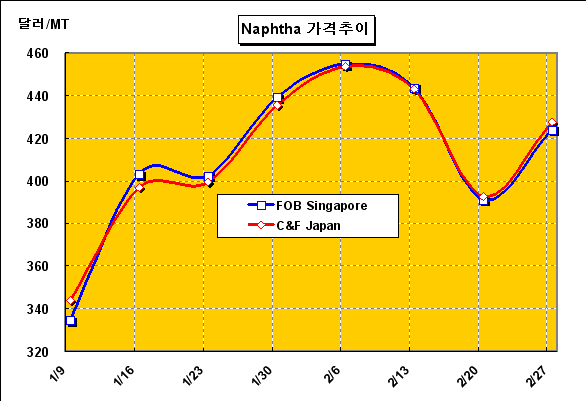 아시아의 구매 수요가 급증하고 북서유럽산 Spot 물량 공급부족으로 프리미엄 그레이드 가격이 치솟았기 때문이다. 다만, 3월 크랙스왑(Crack Swap)은 배럴당 -0.6달러로 마감했다. <이연숙 기자> 표, 그래프: | Naphtha가격추이 | <화학저널 2009/3/2> |