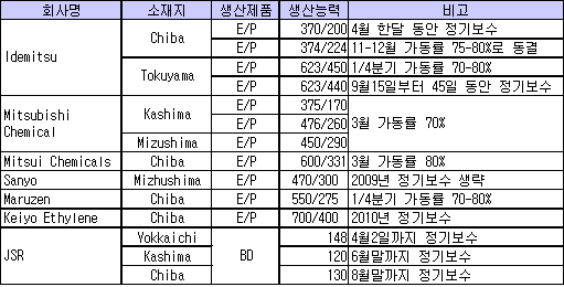 JSR은 Yokkaichi, Kashima, Chiba 소재 부타디엔 플랜트가 각각 3월11일부터 4월2일까지, 5월 중순부터 6월 말까지, 8월 말부터 40일 동안 정기보수에 들어갈 예정이나 전반적인 가동률에는 별다른 영향을 미치지 못할 것으로 예상된다. <이연숙 기자> 표, 그래프: | 일본의 올레핀 크래커 가동현황 | <화학저널 2009/3/11> |