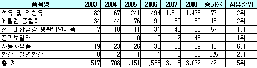 이밖에 황산 및 발연황산 수출도 증가추세에 있다. 이밖에도 2003-2008년 동안 휴대폰의 연평균 수출증가율이 117%에 달하는 등 IT제품을 비롯한 공산품의 수출을 크게 늘어났다. FTA는 같은 기간 물량 품귀현상을 빚기도 한 구리, 아연 등 전략광물을 안정적으로 확보하는 데에도 FTA는 크게 기여했다. 그러나 한국의 칠레시장 점유율은 2008년 5.6%로 전년대비 1.63%p 하락한 반면, 중국산과 일본산은 점유율은 각각 0.61%p와 1%p 상승했고 한국이 칠레로 수출하는 10대 품목 가운데 9개가 일본 또는 중국과 경합하고 있어 품질향상과 제품인지도 제고노력이 필요한 것으로 지적되고 있다. <고우리 기자> 표, 그래프: | 국내 주요 칠레수출 품목 | <화학저널 2009/3/26> |
