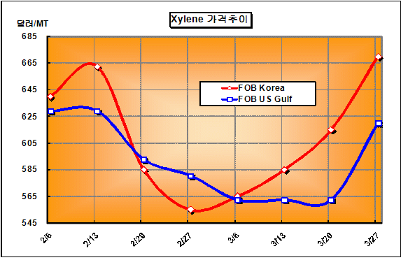 FOB Korea 665-675달러 … 인도네시아 선거 앞두고 수요 부진 M-X 가격은 3월 넷째 주에 FOB Korea 톤당 670달러로 55달러 급등했다.아시아 Solvent 그레이드 M-X(Mixed-Xylene) 가격은 공급부족과 중국의 수요 증가로 4주 연속 상승해 700달러를 위협하고 있다. Solvent 그레이드 M-X 공급부족 현상이 나타나고 있는 가운데 한국산 4월 인도물량이 바닥을 드러냈기 때문이다. 이에 따라 중국 최종수요처들의 Isomer 그레이드 구매가 늘어나면서 가격이 600달러 후반까지 치솟았다. 중국 남부는 M-X 재고가 4000톤에 불과해 최종수요처들이 구매에 적극 나섬으로써 내수 가격이 톤당 6000위안으로 상승했으나 동부는 2만5000톤에 달하는 것으로 알려지고 있다.
