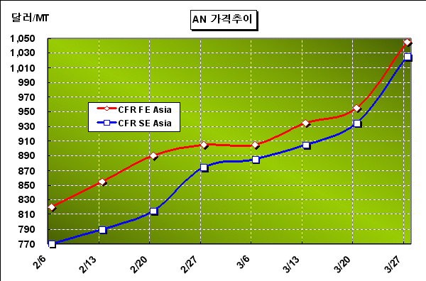CFR FE Asia 1040-1050달러로 90달러 폭등 … 유럽제품 유입이 문제 AN 가격은 3월27일 CFR FE Asia 톤당 1040-1050달러로 90달러 폭등했다.아시아 AN(Acrylonitrile) 가격은 원료 프로필렌(Propylene) 강세와 ABS(Acrylonitrile Butadiene Styrene) 제조용 수요 호조로 초강세를 나타냈다. 프로필렌은 FOB Korea 톤당 790달러로 90달러 폭등했고, ABS도 CFR FE Asia 톤당 1305달러로 역시 90달러 폭등했다.