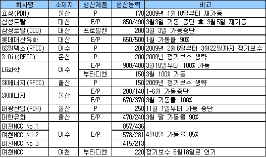 표, 그래프: | 국내 올레핀 크래커 가동현황 | <화학저널 2009/4/3> |