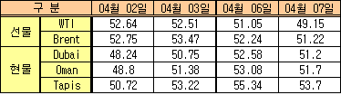 4월7일 WTI 1.90달러 내려 49.15달러 형성 … Brentㆍ두바이유도 하락 4월7일 국제유가는 미국의 주가지수 하락에 따른 투자 불안감 및 달러화 강세 등을 배경으로 하락했다.한국석유공사에 따르면, 뉴욕상업거래소(NYMEX)의 WTI(서부텍사스 경질유) 선물유가는 배럴당 49.15달러로 전일대비 1.90달러, Brent는 51.22달러로 1.02달러 하락했다. 두바이(Dubai)유 현물유가는 전일 다우지수 하락 및 달러화 강세 등의 영향이 뒤늦게 반영돼 1.38달러 하락한 51.20달러에 거래를 마감했다.