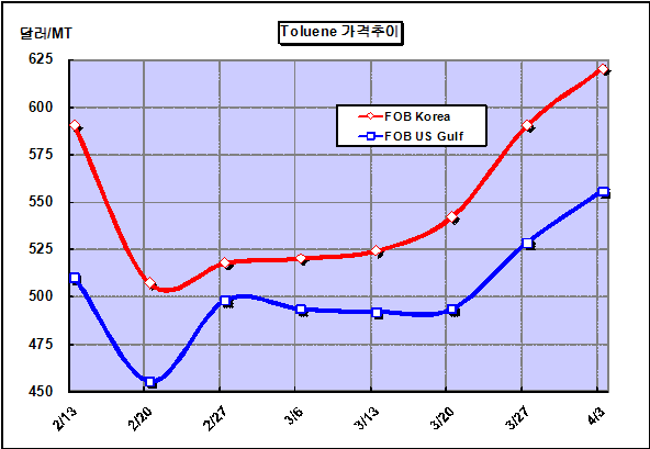 FOB Korea 619-620달러 형성 … 휘발유 성수기 대비 재고 비축 톨루엔 가격은 4월 첫째 주에 FOB Korea 톤당 620달러로 30달러 상승했다.아시아 톨루엔(Toluene) 가격은 다운스트림 벤젠(Benzene) 가격 하락에도 불구하고 중국의 수요 증가로 6주 연속 상승해 마침내 600달러 초반으로 올라섰다. 아시아 벤젠 가격은 587달러로 하락했으나 600달러 안팎을 형성하며 상향 안정화되고 중국 정부의 경기부양책으로 구매 수요가 늘어났기 때문이다. Glencore는 5월 인도물량을 FOB Korea 톤당 610달러에 구매했고, 한화헉유화학은 630달러에 판매한 것으로 알려지고 있다. 중국에서는 남부를 중심으로 10건이 거래돼 재고가 1만톤을 상회하고 있으며 중부 및 북부에서는 정유사들이 휘발유(Gasoline) 성수기에 대비해 재고를 충분히 비축하고 있는 상태여서 구매에 적극 나서지 않고 있다.