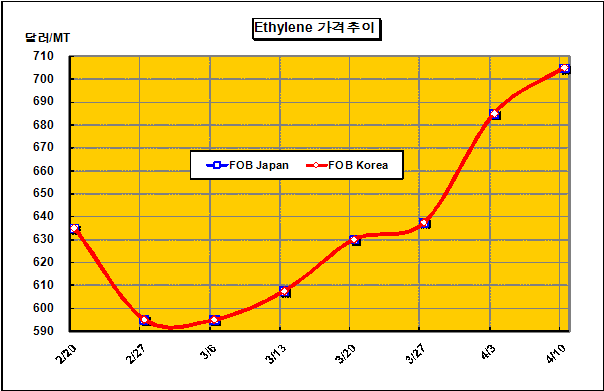 FOB Korea 700-710달러 형성 … 이란산 5월 인도물량 수출 제한 에틸렌 가격은 4월 둘째 주에 FOB Korea 톤당 705달러로 20달러 상승했다.아시아 에틸렌(Ethylene) 가격은 공급부족이 기조를 형성하고 있는 가운데 국제유가 상승과 다운스트림 수요 호조에 힘입어 700달러 초반으로 훌쩍 뛰어올랐다. 미국의 원유 재고 증가폭이 예상에 미치지 못하는 것으로 알려지고 주가가 큰 폭으로 상승하는 등 경기회복에 대한 긍정적인 지표가 나타남에 따라 국제유가가 배럴당 52달러로 5.8% 상승했기 때문이다. Shanghai Secco와 Sinopec이 4월 중순부터 1-2달 동안 정기보수에 들어가고 이란의 Marun Petrochemical이 최근 에틸렌 110만톤 크래커를 재가동했으나 Bandar Imam 소재 41만1000톤 크래커가 가동을 중단한 상태여서 이란산 유입이 제한됨으로써 공급부족이 심화된 것도 에틸렌 가격 상승 요인으로 작용했다.