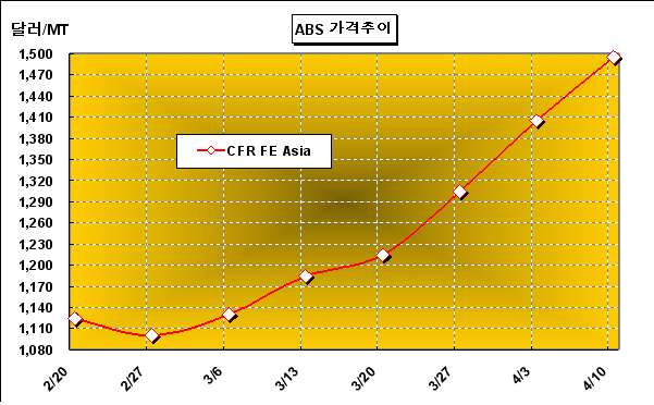 CFR SE Asia 1490-1500달러 … 중국의 경기부양책 효과에 힘입어 ABS(Acrylonitrile Butadiene Styrene) 가격 폭등행진이 지속되고 있다.아시아 ABS 가격은 4월8일 전주대비 90달러 폭등하며 CFR China 톤당 1490-1500달러를 형성해 1500달러까지 돌파했다. 4월 하순 및 5월 초순 공급물량이 CIF Hong Kong/China 톤당 1470-1520달러 수준에서 거래되고 있다. 중국의 경기부양정책에 힘입어 가전 및 전기전자 제품 수요가 급격히 회복되면서 가격폭등이 이루어지고 있는 것으로 해석된다.