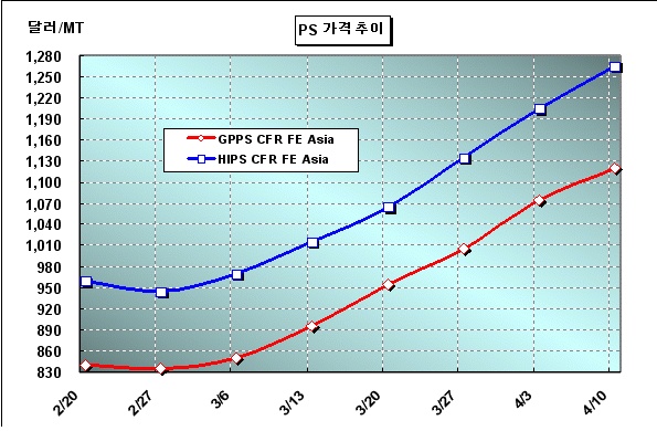 HIPS, CFR China 1265달러 … PS 가동률 상승은 하락요인으로 아시아 PS(Polystyrene) 가격 상승세가 지속되고 있다.HIPS(High Impact PS) 가격은 4월8일 전주대비 60달러 급등해 CFR China 톤당 1260-1270달러를, GPPS (General Purpose PS)는 45달러 오르며 CFR China 톤당 1120달러를 형성했다 원료인 SM(Styrene Monomer) 상승세에 덩달아 가격상승이 이루어진 것으로 분석되며, 수요도 호조를 나타내 탄력받고 있다. SM은 CFR China 톤당 1025달러, FOB Korea 톤당 1007달러를 형성했다.