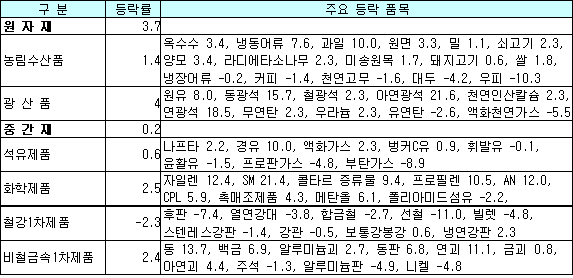 화학제품은 유가상승에 따른 원료코스트 상승 및 중국의 수요 증가를 배경으로 자일렌(Xylene), SM (Styrene Monomer), 프로필렌(Propylene) 등이 오르면서 2.5% 상승했다. 광산품은 유연탄, 액화천연가스가 계절적 비수기로 내렸으나, 원유를 비롯해 동광석, 아연광석 등 연료광물 및 기타광물이 전반적으로 오르면서 4.0% 상승한 반면, 철강1차제품은 세계경기 침체에 따른 수요 부진과 철광석, 니켈 등 국제원자재 가격하락으로 후판, 열연강대, 합금철, 선철 등 대부분의 제품이 내리면서 2.3% 하락했다. <고우리 기자> 표, 그래프: | 원자재 및 중간재 수입물가 변화(2009.3) | <화학저널 2009/4/16> |