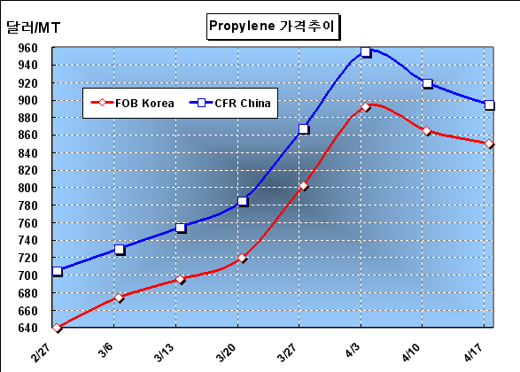 FOB Korea 849-851달러 … 역외물량 유입에 AN 가동률 떨어져 프로필렌 가격은 4월 셋째 주에 FOB Korea 톤당 850달러로 15달러 하락했다.아시아 프로필렌(Propylene) 가격은 역외물량 유입과 중국의 운송 차질, 다운스트림 수요 부진으로 2주 연속 하락해 800달러도 위태롭게 됐다. 아프리카, 유럽, 미국산 역외 물량이 대거 유입된데 이어 사우디의 PetroRabigh가 최근 PP(Polypropylene) 70만톤 및 PO(Propylene Oxide) 40만톤 플랜트의 가동을 시작하고 본격적으로 수출에 나섰기 때문이다. 여기에 중국 동부 항구의 짙은 연무 때문에 교통 대란이 빚어지면서 Yangzi River 어귀에서 화학제품 및 가스 탱크 500척의 발이 묶여 중부로 운송하지 못하고 있는 것도 프로필렌 가격 하락 요인으로 작용했다.