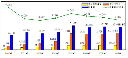 환경부, 2007년 0.2% 감소 4만7796톤 … 정유ㆍ화학기업 배출율 낮아 2007년 국내기업의 화학물질 배출량이 소폭 줄어든 것으로 나타났다.환경부는 388종 화학물질 가운데 1가지 이상을 연간 1-10톤 이상 취급(제조 또는 사용)한 3012개 사업장을 대상으로 2007년도 화학물질 배출실태를 조사한 결과 국내기업의 화학물질 배출량 추이 219종 1억2782만톤의 화학물질이 취급됐으며 0.04%인 209종 4만7688톤이 환경으로 배출된 것으로 나타났다.