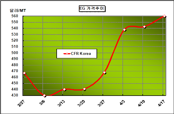 CFR Korea 557-563달러 형성 … 중동 플랜트 생산 차질 봇물 MEG 가격은 4월 셋째 주에 CFR Korea 톤당 560달러로 17달러 상승했다.아시아 MEG(Monoethylene Glycol) 가격은 중동산 유입 제한과 중국의 구매 수요 증가에 힘입어 500달러 중반으로 올라섰다. 중국의 폴리에스터(Polyester) 생산기업들의 구매수요가 늘어난 가운데 PetroRabigh가 예상치 못한 기계결함으로 스팀 크래커의 가동을 중단하고 수출을 5월말에서 6월 말로 중단한데 이어 Jubail Petrochemical이 가스 냉각기 결함으로 No.1 플랜트의 가동을 중단하고 연기함으로써 공급부족이 우려됐기 때문이다.