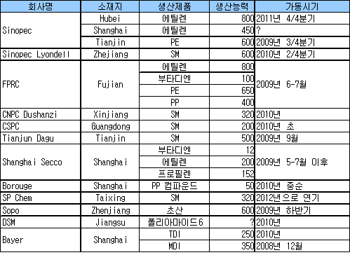 SinopecㆍFRPCㆍTianjin 2009년 가동 … Sinopec-SK 2011년 가동 중국이 올레핀 신규 크래커가 가동을 눈앞에 두고 있다.FRPC는 Fujian에서 건설하고 있는 에틸렌 80만톤 크래커를 2009년 6-7월, Tianjin Dagu는 Tianjin 소재 SM 50만톤 플랜트를 2009년 9월 가동할 예정이다. Shanghai Secco는 Shanghai에서 에틸렌 20만톤 및 프로필렌 15만2000톤 크래커, 부타디엔(Butadiene) 1만2000톤 플랜트를 2009년 5-7월 가동할 계획이나 세계경제 침체 심화로 가동이 연기될 가능성도 배제할 수 없는 상태이다.