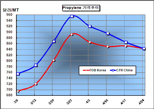 프로필렌 가격은 4월 넷째 주에 FOB Korea 톤당 843달러로 10달러 하락했다.