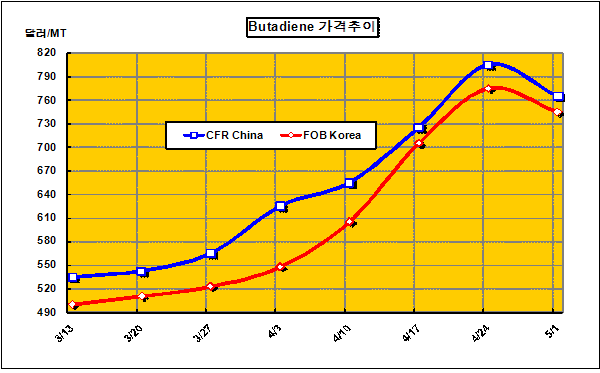 FOB Korea 740-750달러 형성 … 역외물량 유입ㆍ내수가격 하락 부타디엔 가격은 4월 넷째 주에 FOB Korea 톤당 745달러로 30달러 하락했다.아시아 부타디엔(Butadiene) 가격은 중국의 구매수요 감소, 역외물량 유입, 일본의 수출 확대가 겹쳐 7주 만에 하락세로 전환돼 700달러 초반에 안착했다. 중국의 최종수요처들은 부타디엔 내수가격이 톤당 5900(703달러)로 하락하자 최종제품 수요처들이 Spot 물량보다는 내수제품 구매를 선호하고 역외물량 2만톤이 유입됨으로써 5월말까지 재고를 충분히 확보할 수 있다는 기대감에 구매를 보류하고 있기 때문이다.