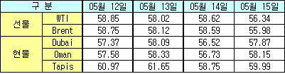 5월15일 WTI 2.28달러에 Brent 2.61달러 내려 … 두바이유는 상승 5월15일 국제유가는 경기침체에 따른 주가 하락 및 석유수요 감소 우려, 달러화 강세 등을 배경으로 하락했다.한국석유공사에 따르면, 뉴욕상업거래소(NYMEX)의 WTI(서부텍사스 경질유) 선물유가는 배럴당 56.34달러로 전일대비 2.28달러, Brent도 55.98달러로 2.61달러 폭락했다. 두바이(Dubai)유는 전일 미국증시 반등의 영향이 뒤늦게 반영돼 1.35달러 상승한 57.87달러에 마감했다.