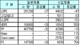 2009년 1-3월에는 HDPE(High-Density Polyethylene)나 PP(Polypropylene)의 수입비중이 10% 안팎으로 확대되는 등 최근 수년간 연간 수입량이 2000톤에 불과했던 PS(Polystyrene) 수입도 급증하고 있다.