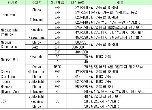 일본 크래커 평균 가동률 80% 상회 … Mitsui Chemicals도 85-90% 일본이 올레핀 크래커 가동률이 상승세를 나타내고 있다.프로필렌(Propylene) 가격은 810달러로 3달러 하락했으나 여천NCC의 크래커 가동 중단으로 공급부족이 초래되면서 에틸렌 및 다운스트림제품 가격이 모두 상승했기 때문이다. Nippon Oil의 Kawasaki 소재 에틸렌 40만4000톤 크래커를 비롯해 Sumitomo Chemical, Ciba 소재 41만6000톤, Tosoh는 Yokkaichi 소재 52만7000톤, Sanyo는 Mizushima 소재 47만톤 크래커의 가동률을 100%, Maruzen은 80%에서 85%로 끌어올렸다.