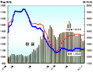 휘발유와 경유는 전주대비 각각 4.6원, 4.8원 상승해 각각 1543.8원, 1622.8원을 기록했다. WTI(서부텍사스 경질유)는 나이지리아의 원유 수출 차질 우려, 미국 정유시설의 화재 소식 및 석유 재고 감소발표 등의 영향으로 전주대비 3.1% 상승했다. 내수가격 결정의 주요 요인인 싱가폴 현물시장의 휘발유는 전주대비 4.0% 상승한 반면, 경유가격 0.5% 하락했다. 최근 원/달러 환율이 안정세를 유지하고 있으나 경기 회복 기대감 등으로 국제유가가 5월 첫째 주 이후 3주 연속 상승하는 등 강세를 보이고 있어 당분간 내수가격도 상승세를 지속할 것으로 전망된다. <고우리 기자> 표, 그래프: | 주유소의 휘발유 및 경유 판매가격 추이 | <화학저널 2009/5/25> |