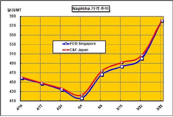 C&F Japan 579-583달러 … 유럽산 LR1 선박 부족에 수출 막혀 나프타 가격은 5월 다섯째 주에 C&F Japan 톤당 582달러로 75달러 폭등했다.아시아 나프타(Naphtha) 가격은 국제유가 상승과 공급부족으로 4주 연속 상승해 마침내 600달러를 넘보고 있다. 미국 상무부가 발표한 GDP 성장률 잠정치가 예비치보다 개선됐다는 소식에 따른 경기회복에 대한 기대감 고조와 달러화 약세에 힘입어 국제유가가 배럴당 66달러를 돌파하며 1달 만에 무려 30% 폭등했기 때문이다. 중동산 7월물 유입이 2주 만에 재개됐으나 운송 기간을 고려하면 당분간 공급부족이 완전히 해소되기 어렵다는 점도 나프타 가격 상승 요인으로 작용했다.