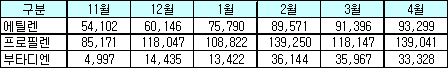 프로필렌 수입 증가ㆍ감소 6달째 반복 … 부타디엔 수입은 7% 줄어 중국의 올레핀 수입이 늘어나고 있다.중국은 에틸렌(Ethylene) 수입량이 11월 5만4102톤으로 다시 16% 감소했고, 12월 6만146톤으로 11%, 2009년 1월 7만5790톤으로 26%, 2월 8만9517톤으로 18% 급증했으며 일부 크래커가 정기보수나 기계결함을 이유로 가동을 중단함으로써 3월 9만1396톤, 4월 9만63299톤으로 5달 연속 증가세를 나타냈다.