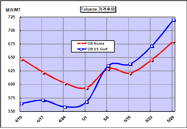 FOB Korea 679-680달러 … 드라이빙 시즌 맞아 수요 증가 톨루엔 가격은 5월 다섯째 주에 FOB Korea 톤당 680달러로 35달러 상승했다.아시아 톨루엔(Toluene) 가격은 국제유가 상승과 구매 수요 증가에 따라 2주 연속 상승해 700달러를 넘보고 있다. 달러화 약세가 장기화되고 있는 가운데 미국의 GDP 성장률 잠정치가 예정치보다 개선됐다는 소식에 최악의 경제위기를 벗어났다는 기대심리가 높아지면서 국제유가가 배럴당 66달러를 상회하며 치솟고 드라이빙 시즌을 맞아 구매 수요가 늘어났기 때문이다. Chemstone은 7-8월 물량에 대해 톤당 677달러, Interchem은 8월 물량에 대해 695달러에 오퍼를 냈으나 공급부족으로 거래는 3건에 그쳤다.