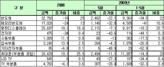 D램은 감산과 투자 축소 등으로 가격이 상승했으나, 수요 회복 지연으로 34.0% 감소했으며, 패널은 패널 가격 안정과 세트기업들의 재고 비축을 위한 수요 확대로 7.1% 감소했다. 국가별로는 중국의 휴대폰과 패널 수출은 증가세로 전환됐으나 반도체, TV부분품 등은 부진했던 것으로 나타났다. 미국은 반도체, 패널 등 전자부품 수출이 부진했음에도 불구하고 휴대폰, 프린터, 셋탑박스 수출 호조에 힘입어 2.1% 증가했고, EU는 휴대폰과 반도체 등의 수출이 부진했던 것으로 나타났다. <고우리 기자> 표, 그래프: | IT 수출현황(2009.5) | <화학저널 2009/6/4> |