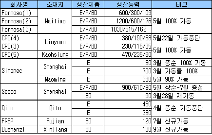 부타디엔(Butadiene) 가격이 5주 연속 하락세를 나타내고 있는 가운데 FREP가 7월부터 Fujian 소재 부타디엔 12만톤, Dushanzi가 Xinjiang 소재 13만톤 플랜트를 가동함으로써 부타디엔 가격이 추가하락할 것이 확실시되고 있다. <이연숙 기자> 표, 그래프: | 중국 올레핀 크래커 가동현황 | <화학저널 2009/6/8> |