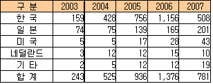 국내기업들은 2006년 이후 출원건수를 줄였음에도 불구하고 LCD 분야 전체출원 가운데 LED 백라이트 출원비중이 2003년 5.1%에서 2007년 17.0%로 크게 높아져, 다른 기술에 비해 LED 백라이트에 대한 특허출원은 상대적으로 중요하게 관리해 온 것으로 나타났다. 주요 출원 기업으로 삼성전자(1238건), LG디스플레이(699건), 삼성SDI(173건), LG전자(94건) 순으로 나타났다. 해외기업으로는 Seiko-Epson(129건), Sony(103건), Hitachi(62건), Sharp(61건), Philips(43건), 3M(19건) 등이 포함됐다. 특허청 관계자는 “특허분쟁에 대비해 세계시장에서 경쟁관계에 있는 주요 외국기업들의 핵심 특허기술을 파악하고 대응전략을 미리 마련해 두는 것이 매우 중요하다”며, “현재 특허청에서 진행하고 있는 <지적재산권 중심의 기술획득전략 사업>은 강력한 특허 포트폴리오 구축을 위한 방법론을 제시하고 있다는 점에서 벤치마킹 대상으로 눈여겨 볼 필요가 있다”고 언급했다. <고우리 기자> 표, 그래프: | LED 백라이트 특허출원 동향 | <화학저널 2009/6/9> |