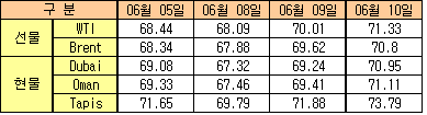 6월10일 WTI 1.32달러 올라 71.33달러 … Brentㆍ두바이도 상승 6월10일 국제유가는 미국 에너지정보청(EIA)의 원유 및 석유제품 재고 감소 발표로 상승했다.한국석유공사에 따르면, 뉴욕상업거래소(NYMEX)의 WTI(서부텍사스 경질유)는 71.33달러로 1.32달러, Brent 선물유가는 70.80달러로 1.18달러 상승했다. 반면, 두바이(Dubai)유 현물유가는 미국 달러화 약세의 영향이 뒤늦게 반영돼 1.71달러 상승한 70.95달러에 거래를 마감했다.
