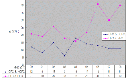 프레온 대체물질로 HCFC( Hydrochlorofluorocarbon)가 개발돼 관련 출원이 증가했으나, 프레온 가스와 마찬가지로 오존파괴물질로 취급되면서 2016년부터 생산 및 사용 이 엄격히 규제될 것으로 예상된다. 특허청에 따르면, CFC 및 HCFC 출원은 2004년까지 꾸준하다가 2004년을 정점으로 점진적으로 감소하고 다. 그러나 최근에는 친환경적이면서 프레온 가스를 대체하는 HFC(Hydrofluorocarbon), PFC(Perfluorocarbon)가 등장해 세력를 넓혀가고 있으며, 구체적인 사용 규제는 아직까지 없는 상태이다. HFC, PFC 관련충원은 2004년 이후 급증하기 시작해 최근까지 꾸준히 증가하고 있으나 외국기업에 거의 독점하고 있어 개발노력이 뒤따라야 할 것으로 지적되고 있다. <고우리 기자> 표, 그래프: | HFC 및 PFC 관련기술 출원동향 | <화학저널 2009/6/12> |