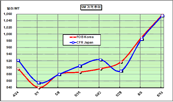 SM 가격은 6월 둘째 주에 FOB Korea 톤당 1058달러로 68달러 급등했다.