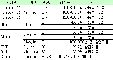 표, 그래프: | 중국ㆍ타이완 올레핀 크래커의 가동현황(2009) | <화학저널 2009/6/19> |