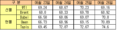 6월26일 1.73달러 상승 70.80달러 형성 … WTIㆍBrent는 하락 6월26일 국제유가는 미국의 경제회복 지연 가능성에 따라 석유 수요 부진이 우려되는 가운데 나이지리아 정정불안이 완화될 가능성이 제기되면서 하락했다.한국석유공사에 따르면, 뉴욕상업거래소(NYMEX)의 WTI(서부텍사스 경질유)는 69.16달러로 1.07달러, Brent 선물유가는 68.92달러로 0.86달러 하락했다. 두바이(Dubai)유 현물유가는 나이지리아의 정정불안, 휘발유 시장 강세 등의 소식이 뒤늦게 반영돼 전일대비 1.73달러 상승한 70.80달러에 거래를 마감했다.