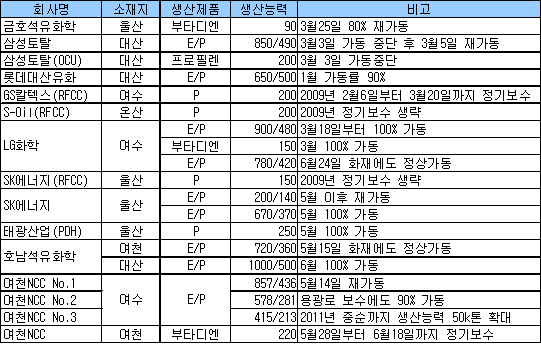 표, 그래프: | 국내 올레핀 크래커 가동현황 | <화학저널 2009/7/1> |