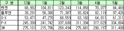 5월 벤젠 8만4469톤으로 20.5% 늘어 … O-X는 5.4% 감소 중국의 Aromatics 수입이 5월 증가세로 전환했다.벤젠(Benzene)과 톨루엔(Toluene)이 20.5%, 18.6% 급증했고 P-X(Para-Xylene)와 SM(Styrene Monomer)은 5.6%, 7.3% 증가한 반면 O-X(Ortho-Xylene)는 5.4% 감소했다. 벤젠은 1월 51.9%, 2월 17.7% 증가해 12만3343톤을 기록했으나 3월부터 감소세로 돌아서 6.9% 줄었고 4월에는 7만톤으로 38.9% 급감했다가 5월에는 플러스 전환했다. 톨루엔은 12월 30.2%, 1월 43.5%, 2월 26.6%, 3월 31.4%로 꾸준히 증가했으나 4월 12.4% 감소함으로써 수입량이 8만톤 수준에 머물렀으나 5월에는 10만톤에 육박했다. P-X는 1월 1.5% 감소했으나 2월 39.7% 증가해 33만7680톤을 기록했고 3월 7.8% 감소하고 4월에는 다시 1.8% 증가함으로써 혼조세를 나타냈고 5월에는 5.6% 증가했다. SM은 1월 21만5796톤으로 21.6% 감소한 후 2월 24.9%, 3월 2.3%, 4월 5.2% 증가세를 지속했으며 5월에도 7.3% 증가했다.