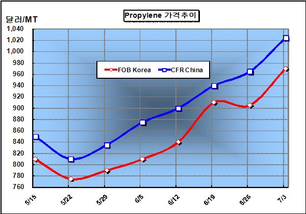 프로필렌 가격은 7월 첫째 주에 FOB Korea 톤당 970달러로 70달러 폭등했다.