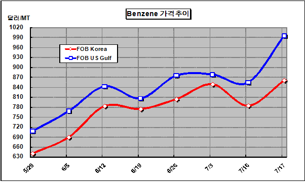 FOB Korea 860-861달러 형성 … 한국은 미국에 2만4000톤 수출 벤젠 가격은 7월 셋째 주에 FOB Korea 톤당 860달러로 76달러 폭등했다.아시아 벤젠(Benzene) 가격은 국제유가 상승, 미국 수출증가, Pygas(Pyrolysis Gas) 공급부족에 따른 생산량 감소에 따라 1주일 만에 상승세로 전환돼 다시 800달러 중후반으로 올라섰다. 미국의 건설수주 호조에 따른 경기회복에 대한 기대감 고조로 국제유가가 배럴당 60달러대를 재돌파하면서 나프타가 553달러로 상승했기 때문이다. 여기에 Pygas 공급부족으로 벤젠 생산이 차질을 빚고 있는 가운데 미국에 7월 중순, 8월 상순 물량 8만톤 수출할 것으로 알려지면서 공급부족 심화가 우려돼 구매 수요가 늘어난 점도 벤젠 가격 상승에 영향을 미쳤다.