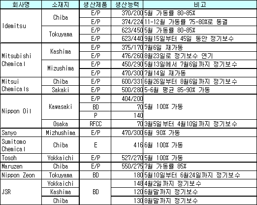 일본 크래커 평균 가동률 85% … IdemitsuㆍMitsuiㆍJSR 정기보수 일본이 올레핀 크래커 가동률이 하락할 것으로 예상된다.중국의 신규 크래커 가동이 8월 중순으로 연기되나 8월부터 9-10월까지 정기보수가 봇물을 이루고 있기 때문이다. Mitsubishi Chemical은 Kashima 소재 No.1 크래커의 정기보수를 연장해 7월6일 재가동하고, No.2 크래커는 6월28일부터 8월14일까지 정기보수하려 했으나 7월6일로 늦춘 후 다시 8월23로 연기했다. 그러나 에틸렌(Ethylene) 생산능력이 47만톤에 달하는 Mizushima 크래커를 7월14일 재가동한 것으로 알려지고 있다.