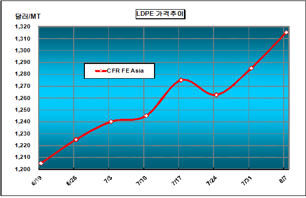 CFR FE Asia 1310-1320달러 형성 … 이란ㆍ미국산 유입 중단 LDPE 가격은 7월 다섯째 주에 CFR FE Asia 톤당 1315달러로 30달러 상승했다.아시아 LDPE(Low-Density Polyethylene) 가격은 역외물량 유입 중단과 이란의 가동 중단에 따른 공급부족으로 1300달러 초반으로 치솟았다. 아시아 모노머 및 폴리머 가격의 고공행진이 이어지고 있지만 유럽 가격이 FD NWE 톤당 1015달러로 초강세를 나타내자 미국기업들이 아시아에서 유럽으로 수출로를 전환했기 때문이다.