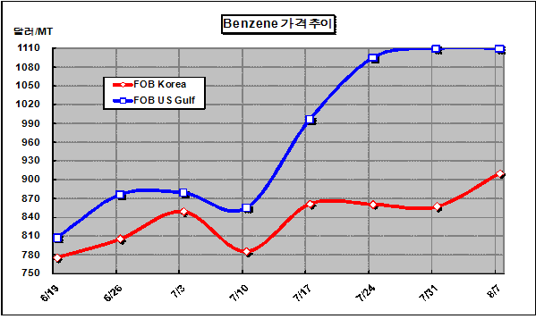 FOB Korea 909-910달러 형성 … SK에너지 3만5000배럴 가동중단 벤젠 가격은 8월 첫째 주에 FOB Korea 톤당 910달러로 54달러 상승했다.아시아 벤젠(Benzene) 가격은 국제유가 및 나프타(Naphtha) 강세, 일부 플랜트의 감산으로 마침내 900달러를 돌파했다. 미국의 경기회복과 달러화 강세에 힘입어 국제유가가 배럴당 70달러를 상회하며 강세를 보이자 나프타 가격이 648달러로 상승한 가운데 일본의 벤젠 생산기업들이 SM(Styrene Monomer) 수요 감소를 우려해 가동률을 감축하고 있기 때문이다. 그러나 Stryndo Mono Indonesia가 8월 중순 SM 플랜트의 가동률을 70%로 감축하는 등 다운스트림 부문의 감산이 이어지고 있어 미국 가격 강세에도 불구하고 10월 물량 가격은 크게 상승하지 않을 전망이다.