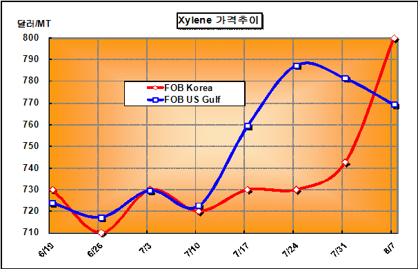 FOB Korea 799-801달러 … 국내기업 LPG 전환에 공급부족 초래 M-X 가격은 7월 다섯째 주에 FOB Korea 톤당 800달러로 58달러 상승했다.아시아 Solvent 그레이드 M-X(Mixed-Xylene) 가격은 국제유가 상승, 공급부족으로 2주 연속 상승해 800달러를 목전에 두고 있다. 국제유가는 미국의 경기회복에 대한 기대감 고조에도 불구하고 달러가 강세를 보이면서 1.4% 하락했으나 배럴당 70달러대를 웃돌면서 초강세를 나타내고 있기 때문이다. 여기에 LG화학, 호남석유화학, 여천NCC를 비롯해 동북아 크래커들이 LPG(Liquefied Petroleum Gas)나 경질 나프타(Naphtha)로 원료를 전환해 M-X 생산량이 줄어들자 8월 Spot 공급을 중단할 것으로 알려지면서 M-X 가격 상승에 영향을 미쳤다.