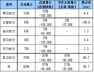 35%가 이산화황 기준 효과 … 일부 상황버섯은 농약 잔류량 과다 수입버섯류의 35%에서 허용기준을 초과하는 이산화황(Sulfur Dioxide)이 검출됐다.한국소비자원은 8월20일 서울, 대전, 광주, 대구, 부산지역의 재래시장과 인터넷 사이트에서 판매하고 있는 수입버섯 6품목, 60개 제품을 수거해 국립농산물품질관리원에 검사를 의뢰한 결과, 57개 제품에서 이산화황이 검출됐고 21개 제품은 허용기준을 초과했다고 발표했다.