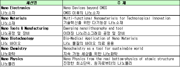 이밖에도 향균용기, 기능성화장품, 공기청정기, 나노도료(페인트), 가습기, 통증완화제, 캡슐형 내시경, 인공장기 등 다양한 분야의 나노제품이 전시된다. 나노코리아에는 삼성전자, LG화학, 실트론, 한화석유화학, 제일모직 등 종합 전자 및 소재ㆍ화학분야 대기업을 비롯 잉크테크, 등 첨단나노소재 기업과 SEMES, 엠파워, 파크시스템즈 등 나노공정ㆍ측정분석전문기업들이 미래를 선도할 기술 및 제품을 출시할 예정이다. 한편, 나노기술분야 혁신적인 연구 성과를 달성했거나, 산업적 파급효과가 큰 제품을 출품한 기업 및 연구인에 대해 정부시상도 진행된다. 특히, 한화나노텍은 전기방전법을 이용한 SWNT(단일벽 탄소나노튜브) 대량제조 및 정제를 출품해 국무총리상을 수상하는 등 총 16명(기업)이 산업기술 및 연구혁신분야별로 수상할 예정이다. <고우리 기자> 표, 그래프: | 나노 심포지엄의 전문세션 및 주제 | <화학저널 2009/8/24> |